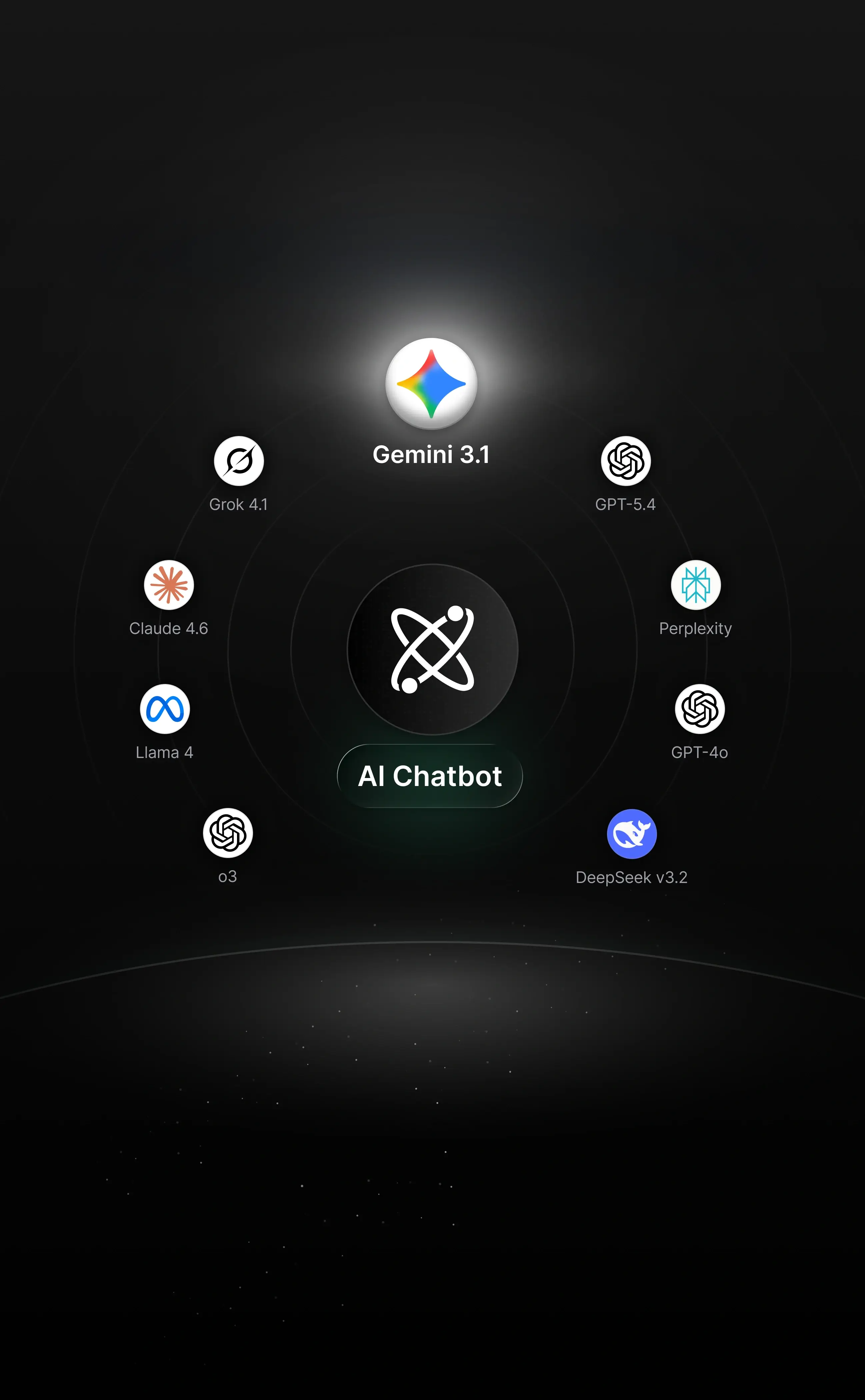 Gemini 3.1 Pro, Gemini 3 Flash, GPT-5.4, DeepSeek-v3.2, Claude Sonnet 4.6, Grok 4.1, GPT-4o, Perplexity, Kimi K2.5, o3, Llama 3.3