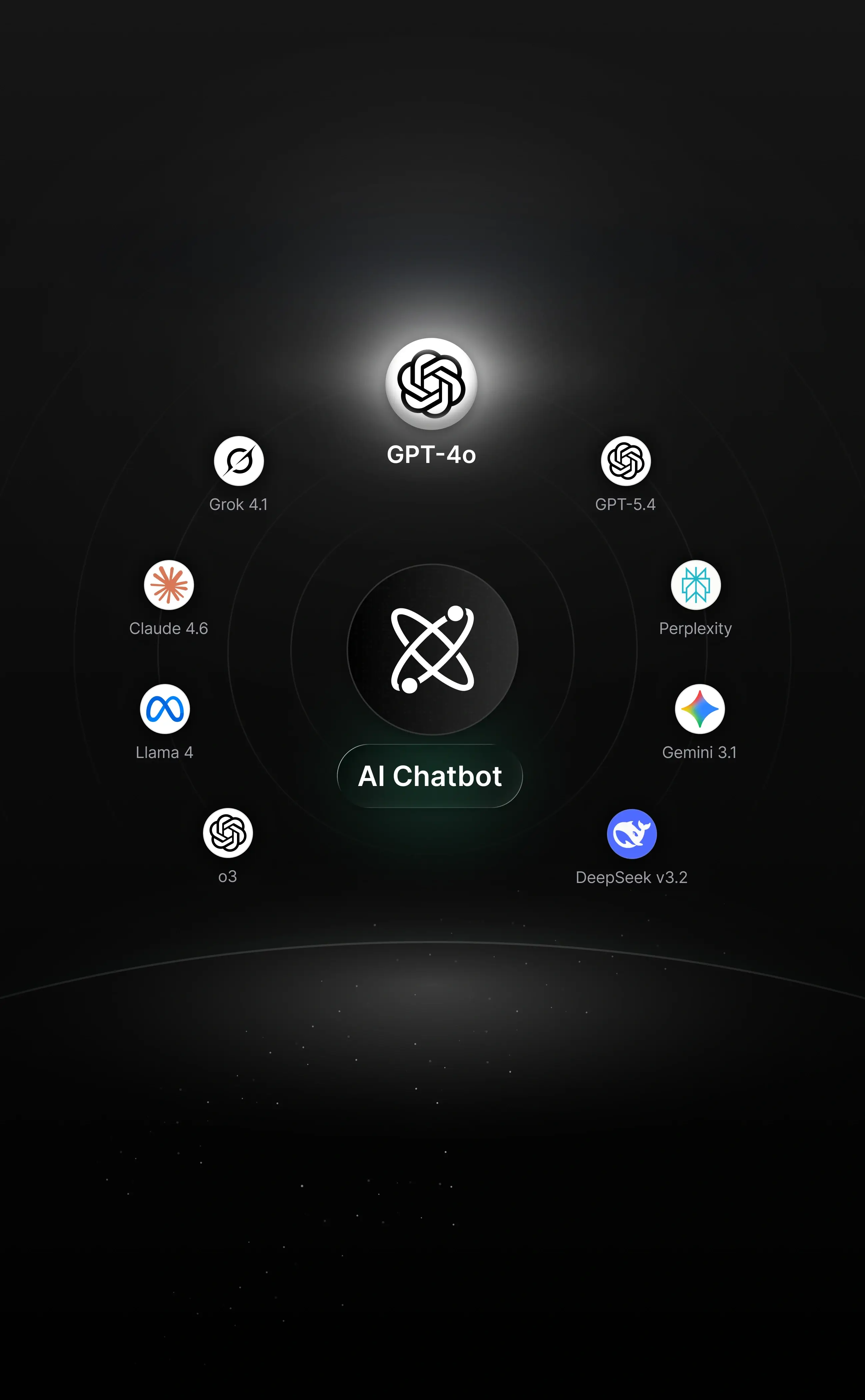 GPT-4o, GPT-5.4, DeepSeek-v3.2, Claude Sonnet 4.6, Gemini 3.1 Pro, Grok 4.1, Perplexity, Kimi K2.5, o3, Llama 3.3
